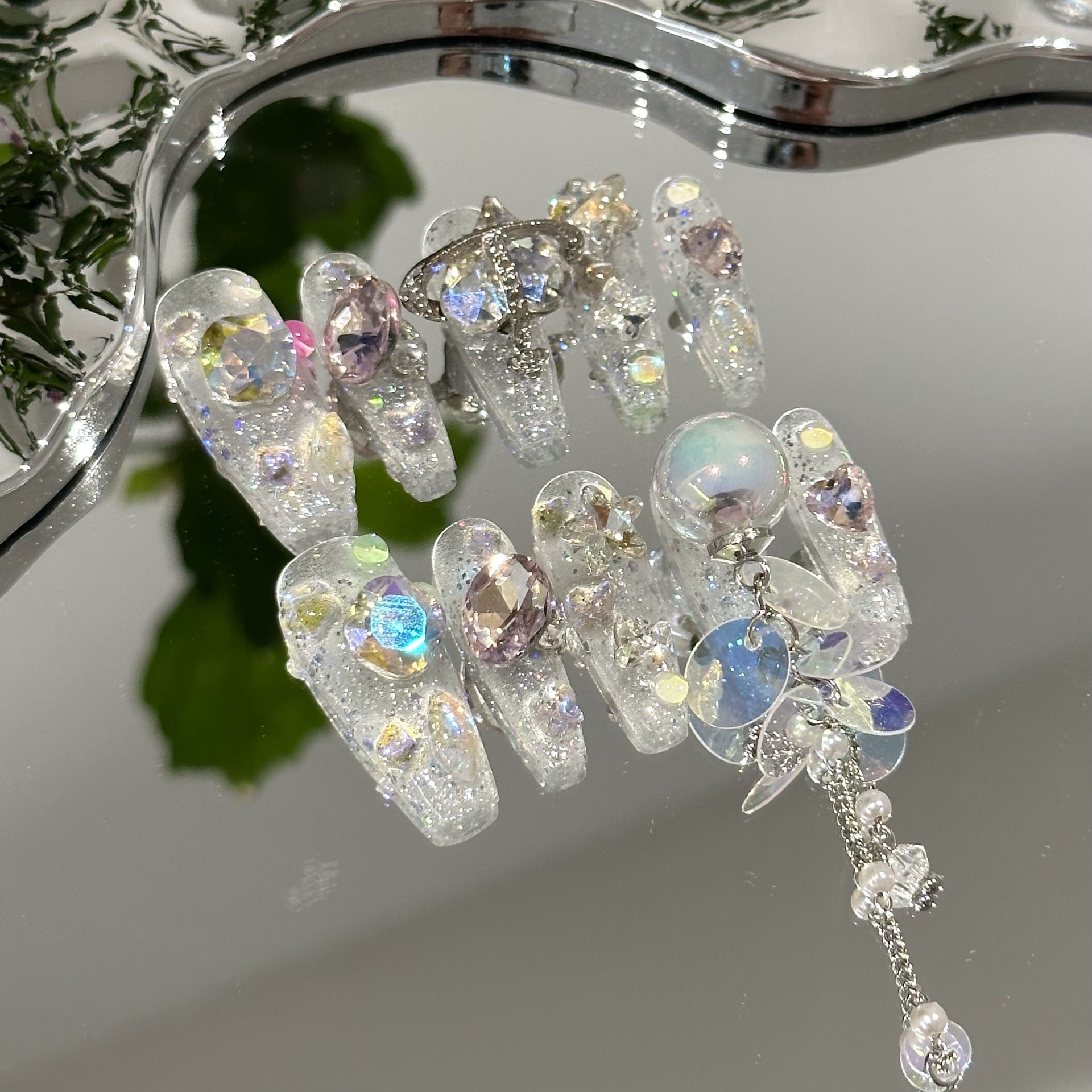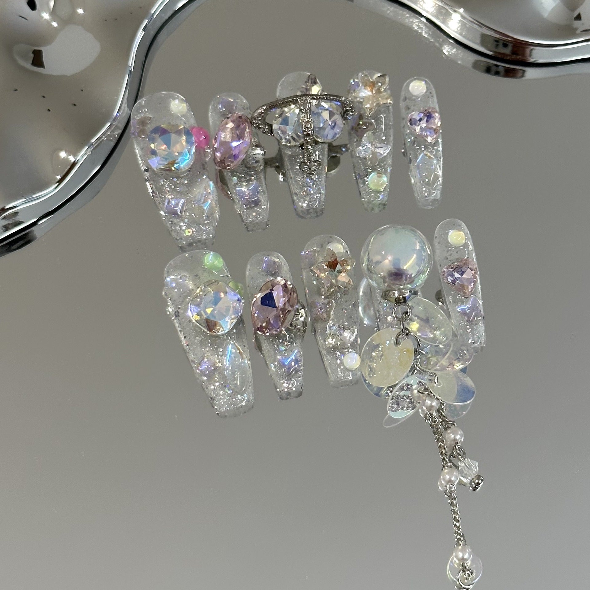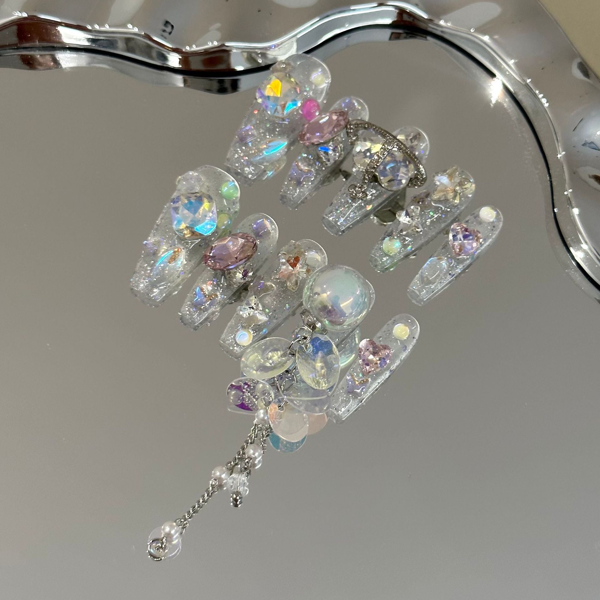 Glossy transparent glitter nails showcase a constellation of iridescent crystals, Saturn ornaments, and tiny star-shaped embellishments. The long pearl-and-sequin tassel adds a playful, ethereal touch, resulting in a dreamy, celestial aesthetic that feels both delicate and bold.
