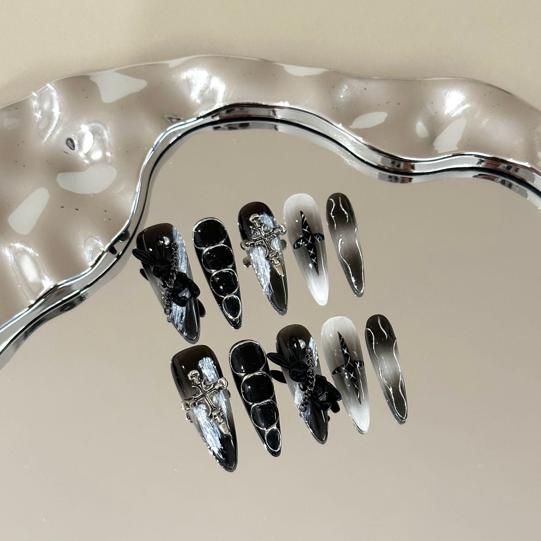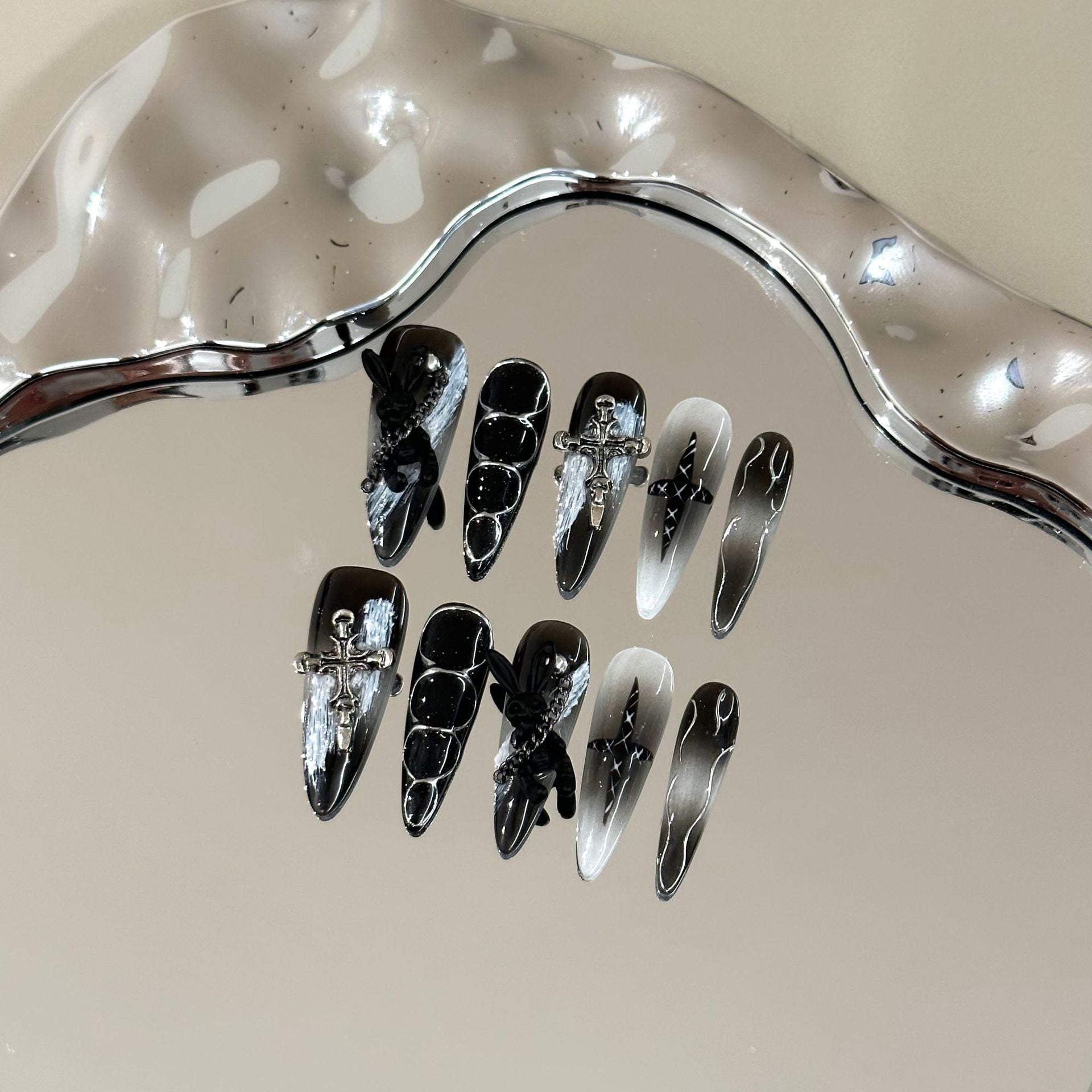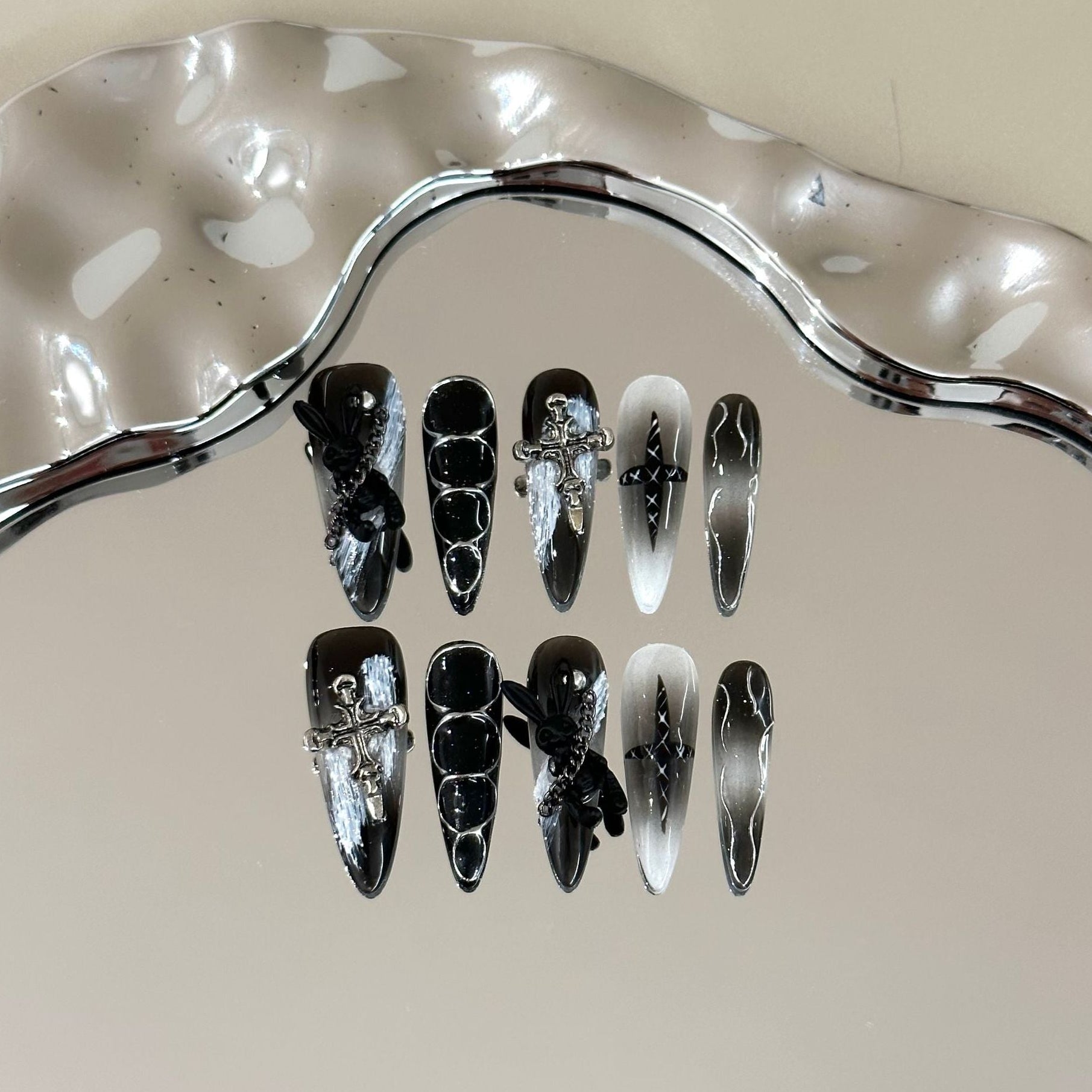 A deep black and smoky gradient base adorned with silver crosses, dark florals, and subtle chrome details. Mysterious and bold, this gothic-inspired design brings a dramatic, statement look to your fingertips.